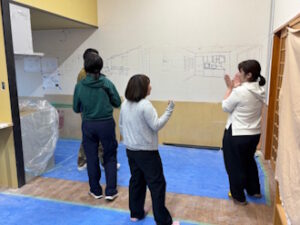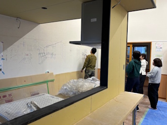気になってやってきた職員と建築士による壁を使った小さな勉強会。